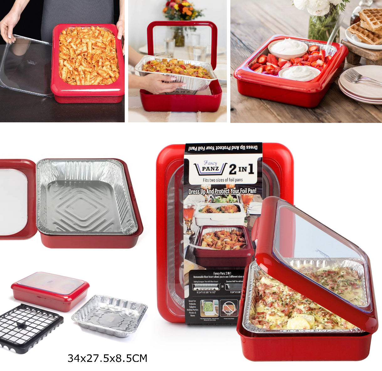 - Perfect for potlucks, tailgating, BBQ's and home. You just place foil pan in Fancy Panz then close the frame to secure foil pan.